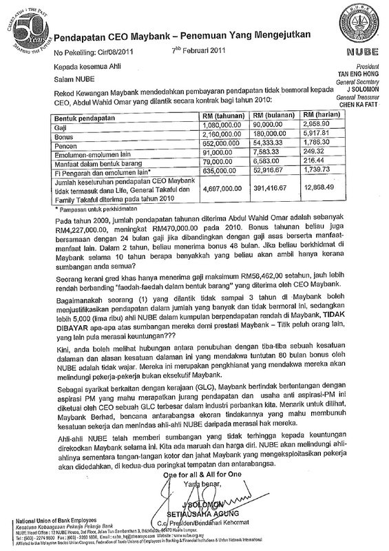 Bagaimanakah pihak pengurusan Maybank terutama ahli lembaga pengarahnya boleh membiarkan situasi sebegini? CEO dibayar bonus jutaan ringgit setahun. Bagaimana dengan kaitangan pertengahan dan bawahan? Berapa gi mereka? Berapa bonus mereka? Kalau begini caranya, keuntungan Bank yang banyak diperolehi daripada aktiviti "Treasury" dan "Trade Financial Services" hanya dapat digunakan untuk membayar bonus CEO dan pihak pengurusan atasannya (top managment). Pendeposit pula dapat apa? Keuntungan sebanyak 3% hingga 5% setahun?